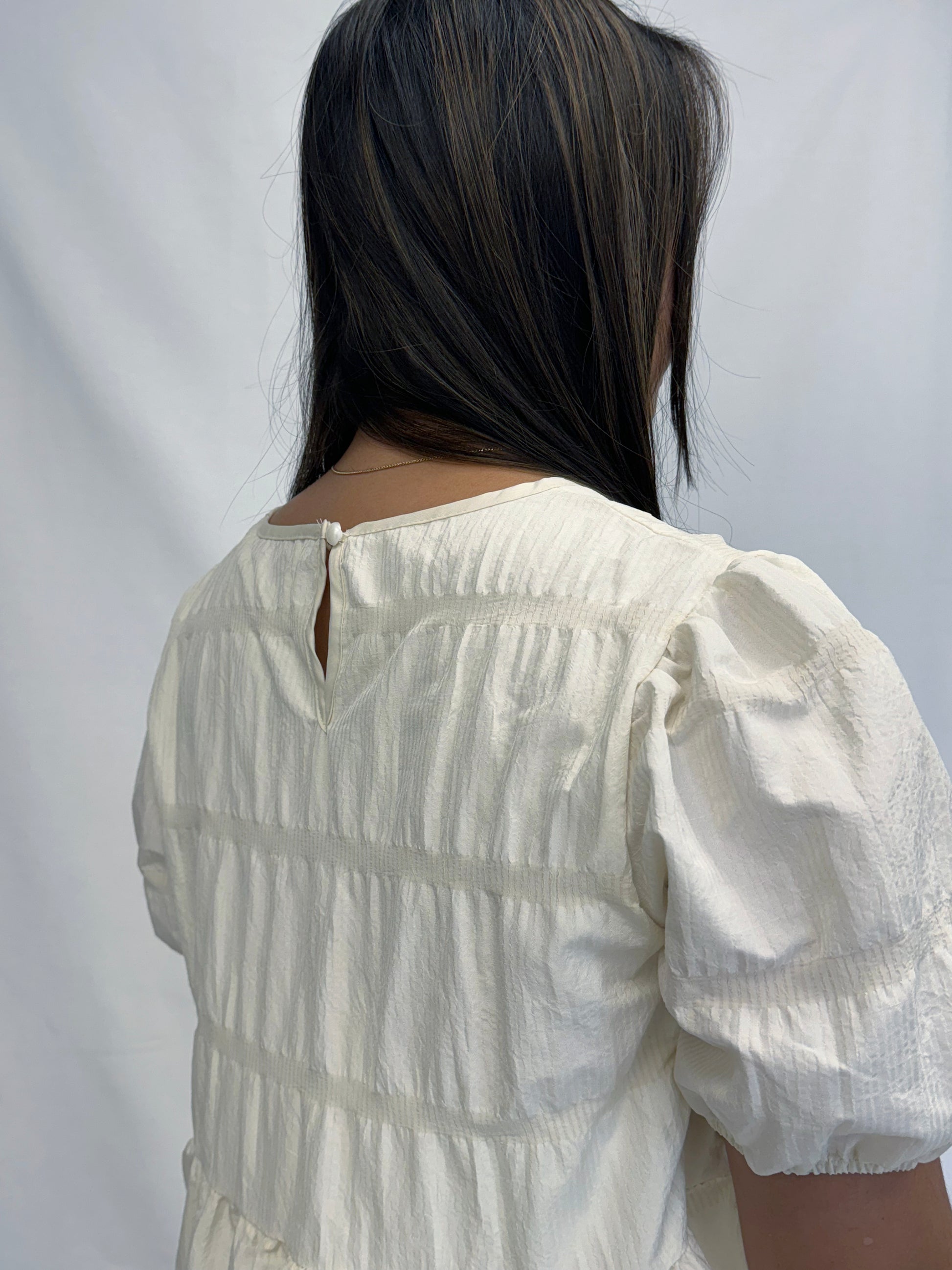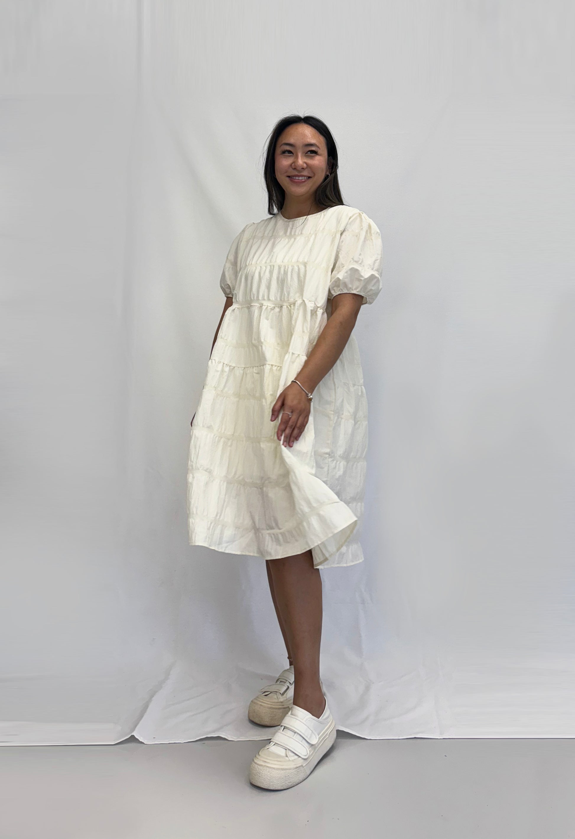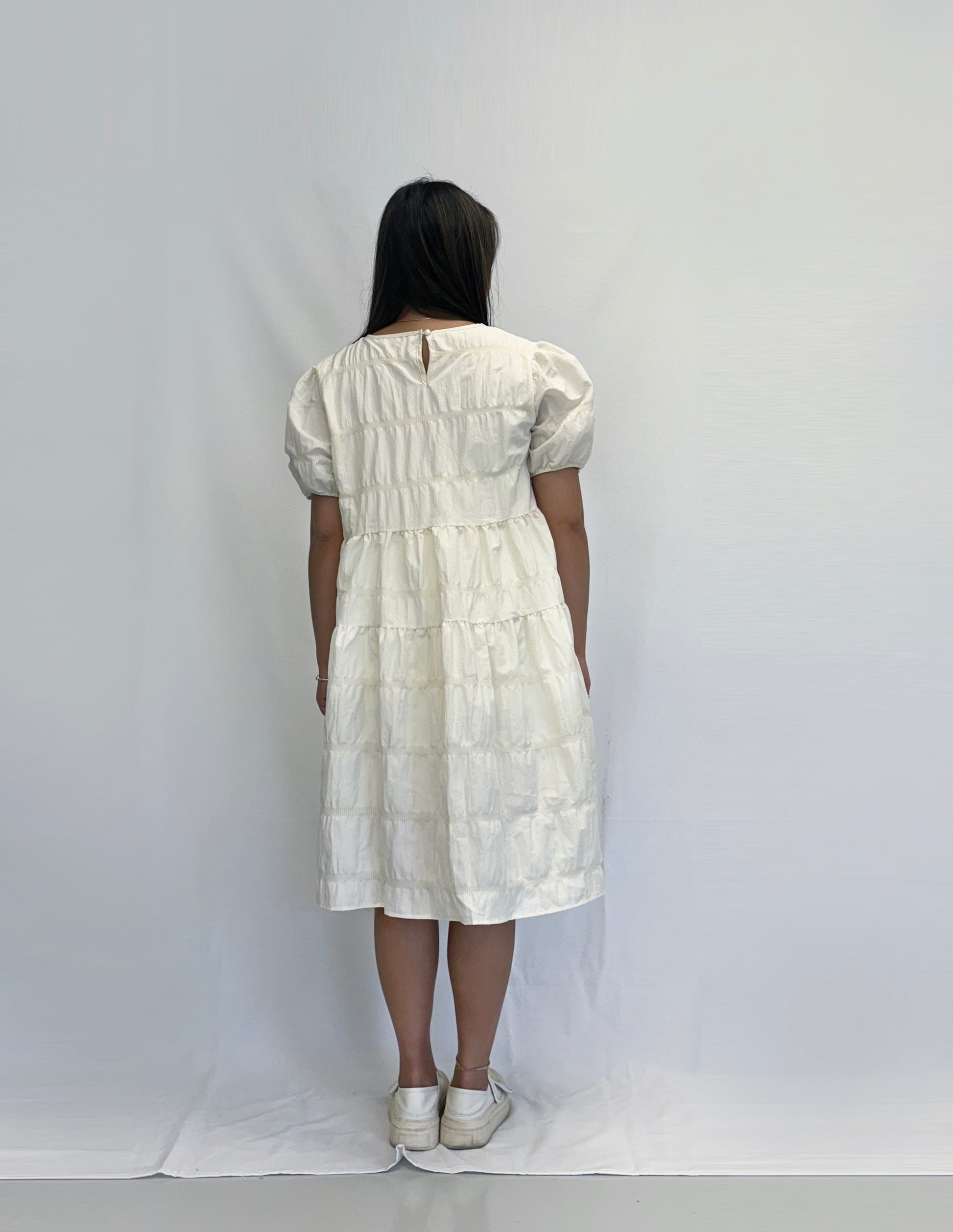 A playful and stylish piece designed for effortless charm. This dress features a classic babydoll silhouette with beautifully tiered layers that create a breezy, flattering shape. Made from a textured, tiled fabric, it adds a unique touch of dimension and detail to the overall look.